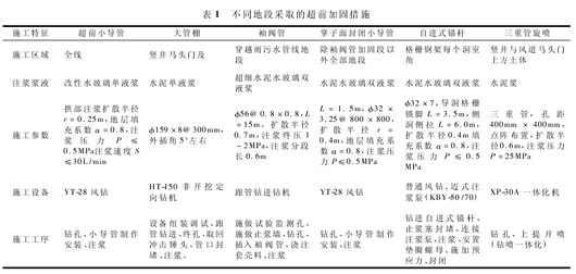 针对本工程的特点及难点,在暗挖施工超前支护中,全线采取超前小导管注浆,在不同地段或地层分别采取大管棚、袖阀管、掌子面封闭小导管、锁脚或张拉自进式锚杆、地面旋喷注浆等 5 种超前加固措施; 注浆材料分别采用的水泥浆、水泥水玻璃双液浆、改性水玻璃及特种水泥水玻璃双液浆等 4 种浆液类型,具体做法统计如表 1 所示。