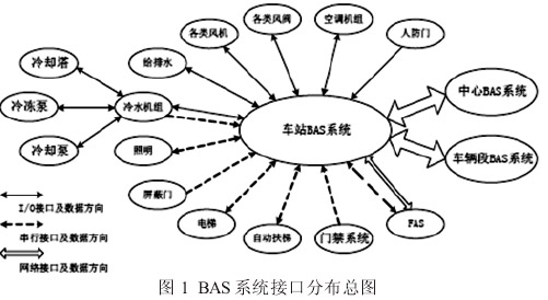 通常, 地铁 BAS系统监控的项目有: 区间隧道通风系统、站厅站台通风系统、设备及管理用房通风系统、空调机组、冷水机组、给排水系统、自动扶梯系统、动力及照明系统,与其相关的系统还有 FAS (火灾自动报警系统)、MTS( 中央母钟系统)、ATS( 列车自动监控系统),此外,根据具体工程的需要可能还会增加一些项目,比如屏蔽门、人防门、电梯等等。为简化系统, BAS一般不对风机盘管、排气扇等进行监控。
