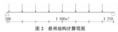 此悬吊结构实际为两跨格构式组合梁,简化起见,按承受8 个集中点荷载的单跨简支梁计算,计算简图见图 2。其中,集中荷载 P =13. 34 kN。