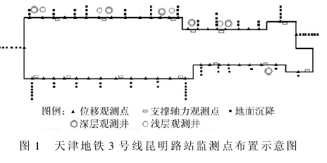 随着城市的发展,城市人口极度膨胀,交通环境日益恶化,修建城市地铁是缓解路面交通拥挤现状,改善城市交通状况的重要途径。地铁工程的建设首先面临的是地铁车站深基坑工程的开挖[1]。在基坑工程施工过程中,由于地质条件复杂,地下管线密集,地铁工程周边建筑物、道路众多等自然或者外部环境等,基坑工程的风险性通常较大,因此极易发生基坑事故[2]。因此地铁深基坑开挖的过程中,对基坑施工期间基坑( 及支护体) 变形和其影响范围内的环境变形、被保护对象以及其它与施工项目有关的内容进行监测,以便及时全面地反映基坑围护体的变化情况,是判断基坑安全和环境安全的主要依据[3]。本文通过对天津地铁 3 号线昆明路站基坑围护体定向位移和支撑轴力的实测数据分析,研究其变形规律,有利于控制围护结构的变形及其周围建筑和地下管线的安全,从而达到避免重大事故发生目的。