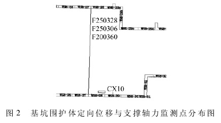图 2 中 CX10 是监测支撑轴力的轴力计监测点; F250328、F250306 和 F200360 是监测围护体定向位移( 测斜) 的测斜管监测点。