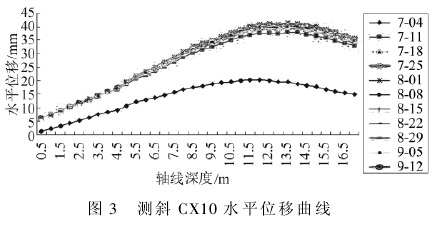 图 3 所示为昆明路站基坑第 7 段开挖后测斜点CX10 在不同开挖时刻变形沿深度分布曲线。