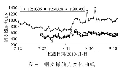 在第 7 段基坑开挖过程中,对与 CX10 在同一断面上的钢支撑轴力计进行监测,分别为 F250306、F250328 和 F200360,数据如图 4 所示。