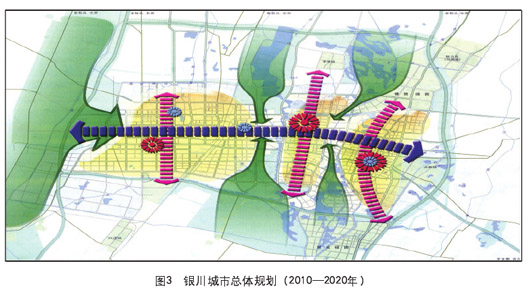 银川市中心城区的风貌特色定位为“塞上湖城、回乡风情、西夏古都”,规划建设成为“文化体育运动休闲之都”的塞上湖城特色旅游目的地。城市空间基本呈东西向发展主轴串联各区,各区内部自然成南北轴线发展的布局。以东西向为主的带状客流特征明显。公交出行占比较高,宜采用轻轨系统。银川城市总体规划(2010—2020年)见图3。