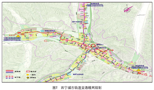 通线网规划方案见图1。西宁市区形成东川、南川、西川、北川的“十”字谷状地形,中心城的空间结构呈现典型的“十”字带状特征,未来城市发展将沿通道向外围延伸。这种城市形态形成自然的东西、南北“十”字型交通发展轴,人流和车流只能沿着交通轴流动。虽然主城区人口规模小,但乘坐公交的出行比例高,需要建设大运量轨道交通来解决交通压力大的局面,基于城市人口规模和经济实力的因素,以轻轨系统建设较为适宜。西宁城市轨道交通线网规划见图2。