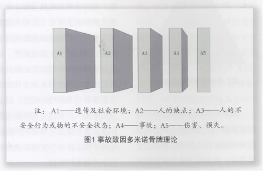 事故致因理论告诉我们,事故是由一串因素以因果关系依次发生的。海因里希提出的事故致因理论 (又称:多米诺骨牌论)认为:伤亡事故是由五个要素按顺序发展的结果,如图1所示。