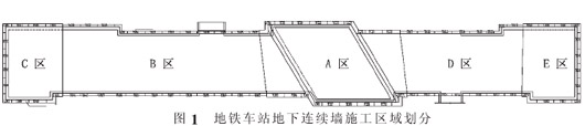 天津地铁3号线北站工程位于天津市河北区中山路西侧,站位横跨十字路口,并与远期规划的地铁6号线车站在路口位置大致呈斜向十字相交。地铁站主体为地下2层岛式车站,局部地下3层为预留与地铁6号线的换乘节点。地铁车站总长197 m,标准段宽度20.5 m,设4个出入口和2个通风道。地铁车站基坑全部采用明挖法施工,标准段(B区、D区)基坑深度约17.6 m,维护地连墙厚800 mm、深31 m,总长222.3延长米,共分为38幅;端头井(C区、E区)基坑的最大开挖深度约19.1 m,维护地连墙厚1 m、深33.2 m,总长135.45延长米,共分为24幅;换乘节点(A区)基坑开挖深度约25.4 m,维护地连墙厚1.2 m、深45 m,总长104.8延长米,共分为18幅。地下连续墙总长约462.57延长米,入土比均为0.7,接头采用锁口管。地下连续墙混凝土强度选用C30,抗渗等级S8。地铁车站地下连续墙施工区域划分,见图1。