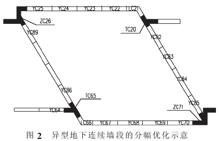 异型地下连续墙段是指除“直线型”外,呈“Z型”、“T型”或“L型”的墙段,异型段成槽难度较大,针对本工程A区地下连续墙斜交的情况,在施工前优化拐角处ZC26、ZC71、TC20、TC65等异型段的分幅,确保拐角节点一次性施工成型,避免出现冷平缝,虽然加大了地下连续墙的施工难度,但使基坑开挖过程中的渗水风险大大降低。异型地下连续墙段的分幅优化示意,见图2。
