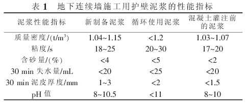地下连续墙开挖槽壁的稳定性影响到邻近建筑物的安全,因此,泥浆需具备比较稳定的物理和化学性质、合适的质量密度和流动性,既要保证泥浆在长时间静置时不产生离析沉淀,又要保证泥浆有良好的触变性。根据本工程的地质情况和以往地下连续墙的施工经验,制备泥浆时选用200目粒径的钙基膨润土,以工业碳酸氢钠为分散剂,并适当添加CMC。施工过程中要随时监测泥浆指标,发现泥浆性能指标不能满足要求时,需及时加以调整。地下连续墙施工用护壁泥浆的性能指标,见表1。