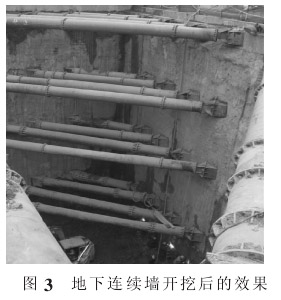2)本工程基坑开挖后,除E区端头井在挖至基坑底部时出现<50 L/d的渗水外,其他部位的墙面基本保持干爽;基坑墙面基本平整,局部达到模板浇筑混凝土的表面效果,为后期车站的“桩墙合一”施工减轻了墙面处理的工作量。相邻两幅接缝处的偏差<2 cm,表明GCS测量系统对提高地下连续墙的垂直控制精度度、防止出现“劈叉”现象起到了良好的效果。地下连续墙开挖后的效果,见图3。