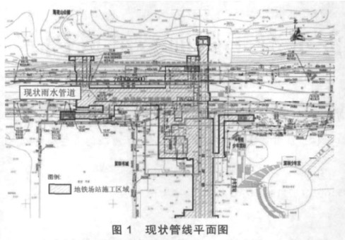 少年宫站位于红荔路与金田路交汇处,深圳少年宫西侧,与地铁 4 号线接驳。车站主体顶板覆土深 3.7 m 左右。地铁施工范围内受影响的现状给排水干管主要有红荔路南侧 DN800 雨水管、DN300 污水管,红荔路北侧 2600×2500 雨水箱涵。图 1 为现状管线平面图。