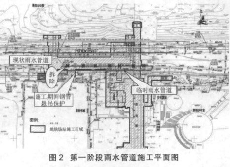 第一阶段,主站体施工前,影响主站体施工的市政管线改迁或悬吊保护(较短路径横跨开挖段时,临时采用悬吊保护方式通过。其间,根据需要部分管线会跟随交通疏解工程进行二次倒边施工)。