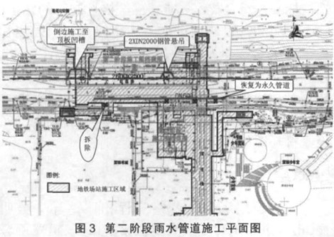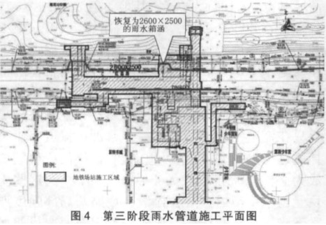 第三阶段,地铁站结构工程完工后,其它需恢复的永久管线的实施。由于受地铁顶板标高的限制,此处的 2 600 m m ×2 500 m m 雨水箱涵需永久改移至地铁预留顶板凹槽处,不需要回迁。