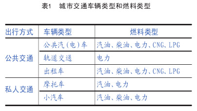 城市客运从交通方式可划分为公共交通和私人交通两大体系(表1)。私人交通主要包括步行、自行车、摩托车、小汽车,公共交通主要包括公共汽(电)车、出租车、轨道交通(地铁、轻轨)。消耗的能源品种主要为石油产品(汽油、柴油)以及电力,压缩天然气(CNG)、液化石油气(LPG)在一些城市公共汽车和出租车中使用。