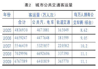 由于城市化进程的加快以及交通工具的多元化发展,城市客运的能源消费总量与用能结构均处于增长与变化中。如表2,2007年,我国城市公共交通的客运总量达到554.6亿人次,耗油约1200万吨,每年运送的客流量要超过整个欧洲1年的客运量。在国家优先发展城市公共交通的政策推动下,我国公共交通运营车辆数与运营里程数总体上处于增长状态,公共汽、电车及轨道交通运营车辆数从2005年的31.3万辆增长到2008年的37.2万辆,年均增长率为6%。其车型结构在不断变化之中,压缩天然气(CNG)公共汽车数目增长较快,2005~2006年间,CNG公共汽车数量从33564辆增长到38788辆,增长率为16%;而液化石油气(LPG)公共汽车数量则从17256辆下降到15726辆,下降率为8.9%(CNG汽车大幅上升是由于天然气汽车的排放指标相对较小,且有利于能源多样化,属于大力发展的对象;LPG汽车则由于排放量不具有明显优势、动力性不足,所以处于减少状态);无轨电车数量稍有下降,基本保持稳定。运营线网长度自2005年以来处于下降或停止增长状态,但运营车辆还在攀升,这表明我国公共交通已基本完成基础设施建设(轨道交通尚在大力发展),未来将进一步提高公共交通的服务水平和服务质量。