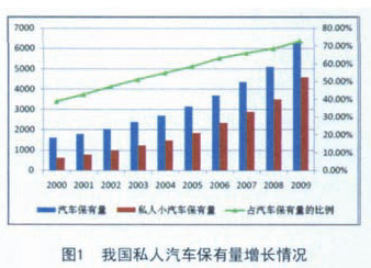 随着我国国民经济持续稳定增长,经济实力得到加强,我国汽车保有量也不断增加。2000年仅为1608.91万辆,而2009年底就急增至6280.6万辆。其中,私人汽车拥有量的迅猛增长是我国汽车拥有量增长的主要原因。从图1可以看出,2000~2009年间,我国汽车保有量一直保持着一个较高的增速,其中的主体是私人汽车的消费,私人汽车保有量占汽车保有量的比重由2000年的38.87%提高到2009年的72.84%,这很大程度上反映了随着城市居民收入水平不断提高,居民的消费结构和消费理念都发生了重大变化,汽车逐渐成为居民生活中的重要消费品,导致了私人小汽车井喷式的发展。