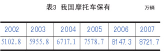 摩托车已成为广大城乡居民重要的出行代步工具。我国自1993~2008年的十余年中,一直是世界摩托车第一生产大国。近年来,我国摩托车产销一直呈现增长趋势(表3)。2008年,摩托车产销量达到2750万辆。在为社会民众提供了大量方便快捷的交通运输工具的同时,在能源消耗率中所占比率也越来越大,并呈明显上升趋势。