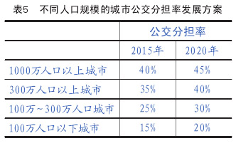 根据城市公共交通“十二五”发展规划纲要(征求意见稿)所述,对不同人口规模的城市,规划了不同的交通发展方案,见表5。
