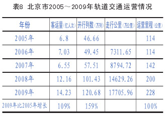 按照前面计算的2020年公交客运总量达到3456亿人次,根据北京市2005~2009年轨道交通运营情况(表8),我们可以推算出到2020年轨道线路运营里程达到6000公里,可承担客运量360亿人次,约占公交系统客运总量的10%,假设这部分出行量是从私人小汽车转移到选择轨道交通出行的,按小汽车每车载客2人次,平均燃料消耗量水平为7升/百公里计算,可节能1483.2万吨标煤,相当于减少二氧化碳排放3114.72万吨。