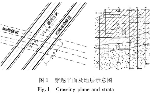 盾构从浦东工作井出洞约 400 m 后,将从 M8线周家渡站 ~ 西藏南路站区间隧道下方穿越。两对隧道成井字型交叉,两者相对位置关系如图 1 所示。两对隧道中心线水平面投影夹角约为 56°,叠交段长度为 28. 7 m。