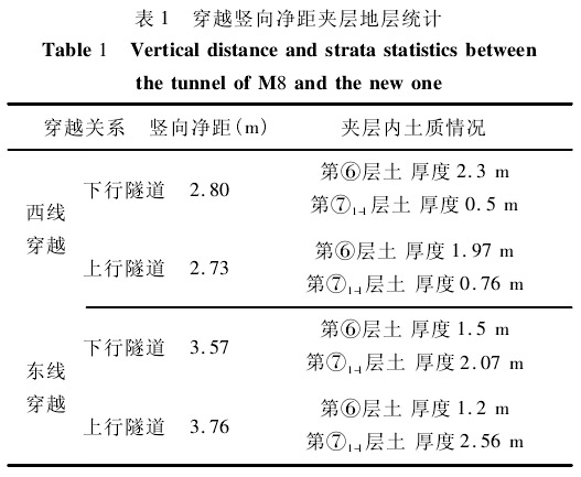 穿越段 M8 线隧道顶覆土约19. 5 m,断面土层主要为第⑤1-2层灰色粉质粘土、第⑥层暗绿色粉质粘土。穿越段越江隧道顶埋深约 29 m,盾构切削区土体主要为⑦1-1层草黄色砂质粉土和⑦1-2层灰黄色粉细砂。西藏南路隧道与 M8 线隧道间夹层内地层情况如表 1 所示。