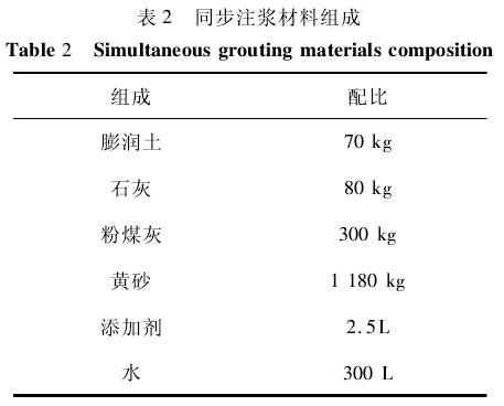 ( 3) 同步注浆 本次盾构施工采用单液可硬性浆液填充管片与盾构之间建筑空隙,其配比如表2 所示:
