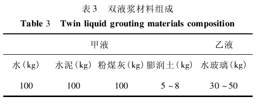 ( 2) 二次注浆 此外在完成穿越,盾尾退出投影区一定距离后,采用环箍形式,进行后期二次双液补浆,其配比如下表 3 所示: