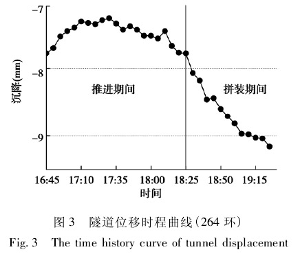 图 3 为西线穿越时,264 环施工期间隧道竖向位移时程曲线。隧道在推进初期上抬,后期维持稳定或者略微下沉; 拼装期间,隧道持续下沉。除去施工出现状况或设备故障的情况,东、西线穿越期间,隧道均表现为上述变形特点。