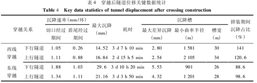 但盾尾经过期间,各次穿越引起隧道下沉幅度不一,尤以西线穿越下行隧道时,沉降相对不明显。