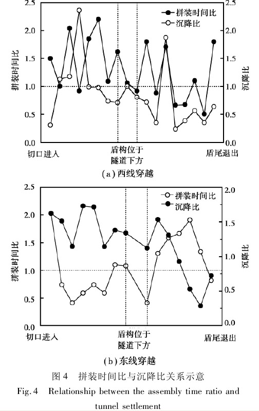 图 4 表示西、东线穿越下、上行隧道时,相同盾构位置处,各环拼装时间比与相应沉降比之间的关系( 剔除了非正常施工环) :
