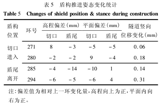 ( 1) 切口进入隧道时: 盾构在该位置,切口已进入隧道下方 3 环,而盾尾暂未进入。由表 5 可知,271 环切口在竖直面内上抬,而盾尾略微下探;280 环盾尾切口均小幅下探。