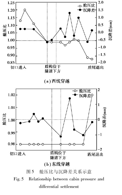 西线穿越初期,舱压比与沉降差表现出一致性,即舱压高的,推进期间沉降小,反之亦然; 但盾尾经过期间,未有明显规律。