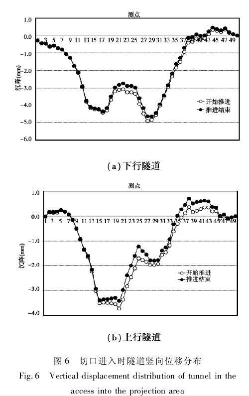 ( 2) 东线穿越对下、上行隧道影响相对较大,累计最大沉降分别为 29. 6 mm 以及 21. 16 mm,前者超过第一次穿越时下行隧道沉降的一倍,原因可归结为: 第二次穿越时,隧道周围土体经过第一次穿越的扰动,位移更难控制; 同时,作为 M8 线隧道直接下卧层,物理力学性质较好的第⑥层暗绿色粉质粘土比第一次薄了 80 cm。