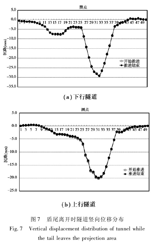 图 7( a) 、( b) 分别为,推进 285 环、294 环前后,下、上行隧道竖向位移分布。