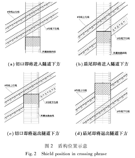 穿越过程按典型盾构位置为阶段划分依据,进行过程分析,如图 2 所示。