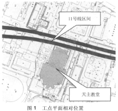 整段区间位于徐汇区内,工程沿线环境复杂,主要控制性建( 构) 筑物有徐汇中学崇思楼、圣爱广场、徐家汇天主教堂、气象大楼、地铁 1 号线、4 号线和上影厂摄影棚等。徐家汇天主教堂属上海市文物保护建筑,并且是重要的宗教活动场所,需要对 11 号线施工、运营期间的影响作详尽分析,并提出相应的保护性措施。11 号线区间隧道与天主教堂木桩桩底竖向净距约 8. 85 m,水平向净距约 1. 24 m。