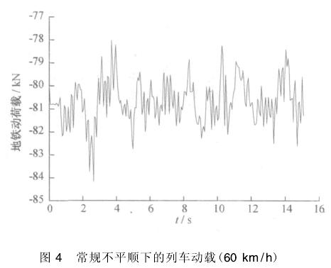 土体、管片等材料计算参数同表 1 所列。列车动荷载采用 60 km/h 时的实测值( 见图 4) ,并考虑双线会车的最不利情况。