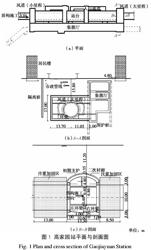 地铁高家园站主要由侧式站台、集散厅、风道、人行通道和出入口等结构组成,见图 1(a)。在高家园站上方的地层中分布着大量的市政管线;5~6 层砖混结构居民楼分布在车站上方地表两侧,见图 1(b)。