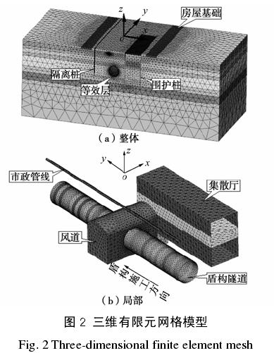 暗挖风道和盾构隧道的覆土厚度分别为 11.2 和15.8 m。根据研究需要,建立的三维有限元模型尺寸x×y×z 分别为 197.0 m×85.3 m×80.0 m,见图 2。模型的侧面和底面为位移约束边界,侧面限制水平移动,底部限制竖向移动,而模型的上边界面为自由地表。房屋结构引起的附加荷载84 kPa施加在房屋基础的位置上。在地表,除了房屋基础的位置外,均施加竖向地面超载 20 kPa。