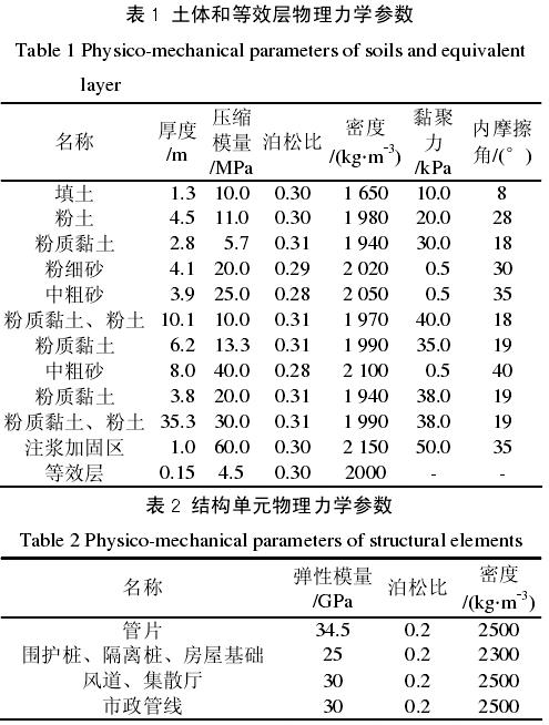 模型中,采用等效层来模拟盾尾注浆效果[14]。土层、风道两侧注浆加固区和等效层的物理力学参数见表 1,管片、风道、集散厅等结构的物理力学参数见表 2。