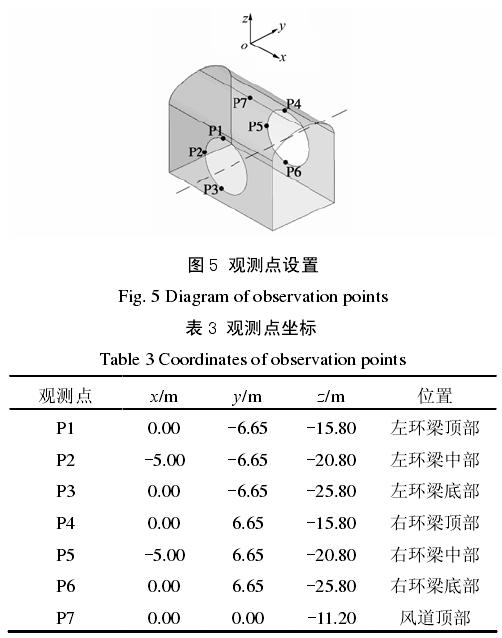 在模型中,选取暗挖风道左、右环梁的顶部、中部和底部及风道顶部等 7 个观测点作为研究对象,见图 5,其位置和坐标见表 3。对观测点的空间位移和应力进行统计,进而分析大直径盾构施工对风道变形和应力的影响。