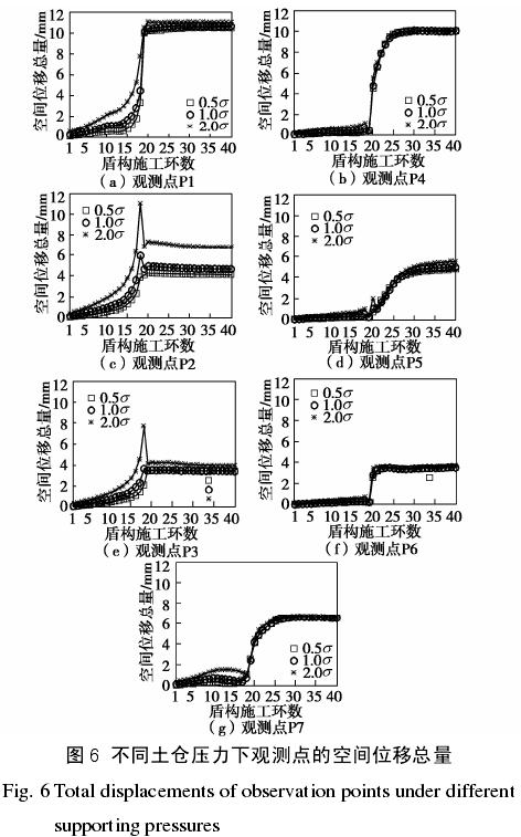 图 6 给出了不同土仓压力下 7 个观测点的空间位移总量。