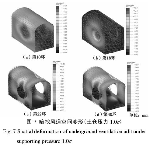 图 7 给出了盾构施工不同环数时风道的空间变形。由图可知:在盾构穿越风道前,风道变形主要集中在左环梁及其附近,盾构施工越靠近左环梁,风道变形也就越大;在盾构穿越风道后,风道左环梁附近变形基本不变,而右环梁附近变形增大;在盾构穿越风道一定距离后,整个风道变形基本稳定。