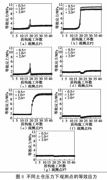 图 8 给出了不同土仓压力下 7 个观测点的等效应力。