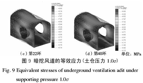 图 9 给出了盾构施工不同环数时风道的等效应力。由图可知:在盾构穿越风道前,风道应力主要集中在左环梁附近,盾构施工越靠近左环梁,风道应力也就越大;在盾构穿越风道后,风道左环梁附近应力基本不变,而右环梁附近应力增大;在盾构穿越风道一定距离后,整个风道应力状态基本稳定。