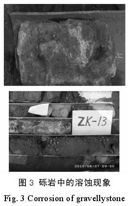 (2)溶蚀风化砾质土均匀性差,透水性较强,物理力学性状较差。为保证设计、施工安全,应在详细查明其分布条件下,调整施工工序,先止水后补强再进行下步工序。