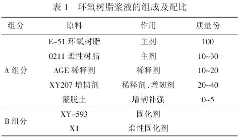 在基体树脂中加入稀释剂、增韧剂、纳米材料等作为 A组分;固化剂作为 B 组分,将 A、B 组分按比例混合,在模具中浇铸成型。环氧树脂浆液的组成及配比见表 1。