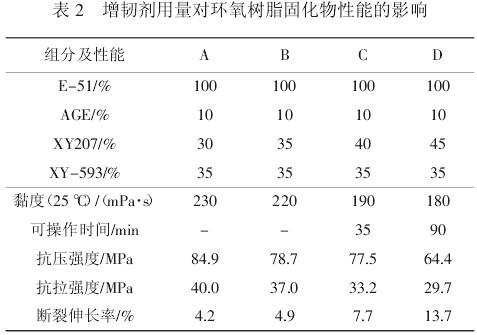 本实验采用添加 XY207 活性增韧剂的方法增加环氧灌浆固化物的弹性,研究了不同增韧剂用量对浆液黏度和固化物性能的影响,结果见表 2。