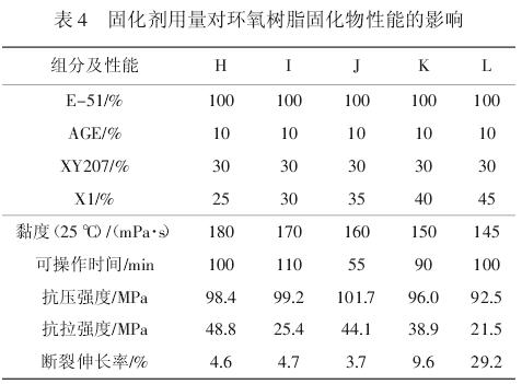 采用实验室自制的柔韧性固化剂 X1 来增加环氧灌浆固化物的弹性,研究了不同固化剂用量对浆液黏度和固化物性能的影响,结果见表 4。