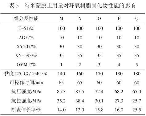 本文采用聚合物级纳米蒙脱土(OMMT)添加到环氧树脂体系中来增加环氧灌浆固化物的弹性,研究了不同 OMMT 用量对浆液黏度和固化物性能的影响,结果见表 5。